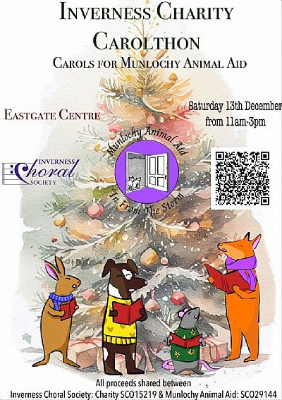 We want to thank Munlochy Animal Aid volunteerAspen Eveleigh (16 years old) for designing our Carolthon poster for this year. We’re sure you’ll agree Munlochy Animal Aid is a very worthy cause, and we hope to see you there on the day.