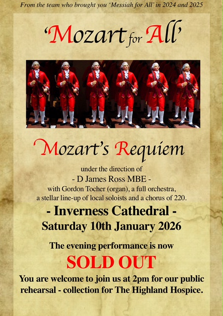 The ‘Mozart for All’ performance of the Requiem on 10th January in Inverness Cathedral is now SOLD OUT! But don’t despair – the afternoon rehearsal at 2pm is open to the public! Come and join us for an epic experience – and most importantly, Highland Hospice volunteers will be on hand to collect your donations for this excellent charity.’