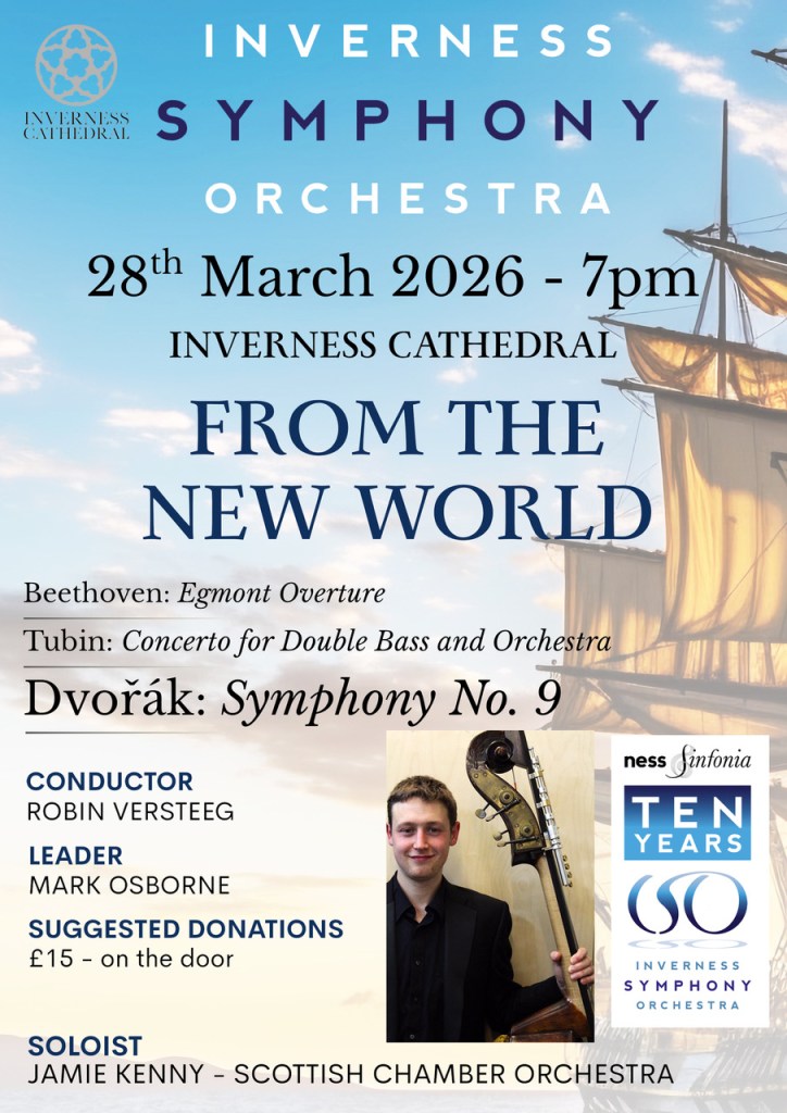 For our spring 2026 concert, Inverness Symphony Orchestra will be joined by the outstanding double bassist Jamie Kenny, principal with the Scottish Chamber Orchestra, for the fantastic and fiendish Concerto for Double Bass and Orchestra by Estonian composer Eduard Tubin. The virtuosity and rhythmic drive of this piece will make a perfect companion to one of the best known and most emotive of all Romantic orchestral works: Antonín Dvořák’s much-loved Symphony No.9. The surging Egmont Overture by Beethoven completes our March line-up.